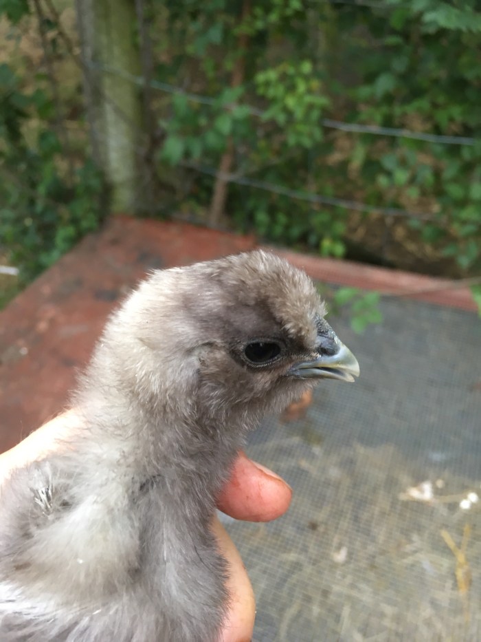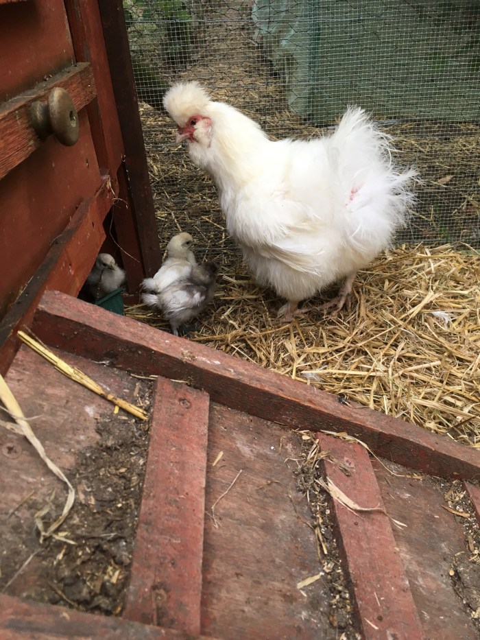 Yesterday, when I took our friend to see the hens and chicks, we discovered Mr Silkie asleep in his house. Only he wasn’t asleep he had expired, quietly and privately. He is now buried in the vineyard. This morning Mrs Silk and the chicks were a bit agitated and, by mistake, I left their door open. They were out in the run in double quick time and I had to round them up and put them back inside to keep them safe. This little one gave me a bit of a runaround.