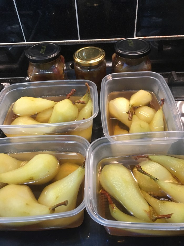 The sweet white wine was pronounced “undrinkable” by husband and son in law (true it was cheap at Tesco three years ago). But I refused to get rid of the bottles and today I have used two of them to make a delicious dish of poached pears in wine syrup.