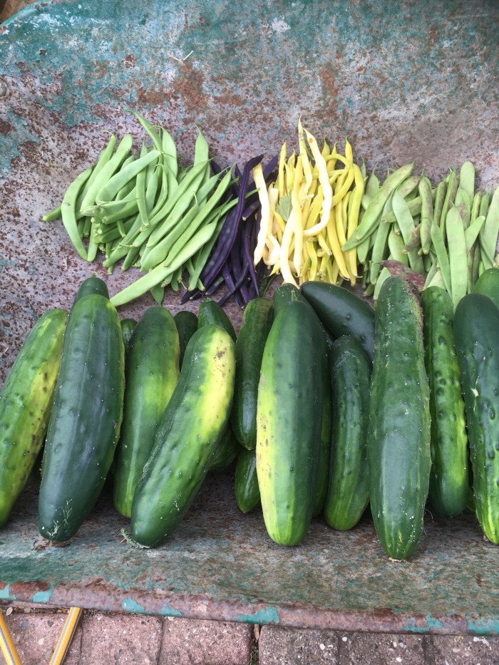 And an afternoon cuppa with an old school friend. I returned to find a wheelbarrow of cucumbers and assorted beans and a soothing sun shining over the garden.
