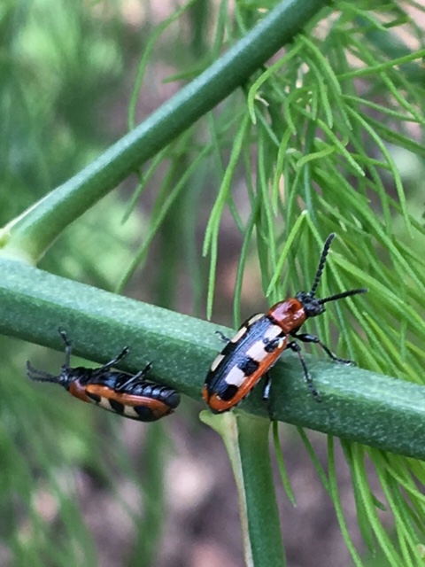 It is called an “asparagus beetle” and it shouldn’t cause too much harm if the numbers remain small. We will have to keep an eye on this in the spring as a heavy infestation can cause crop damage and weaken the plant and cause the spears to form a crook instead of growing straight.
