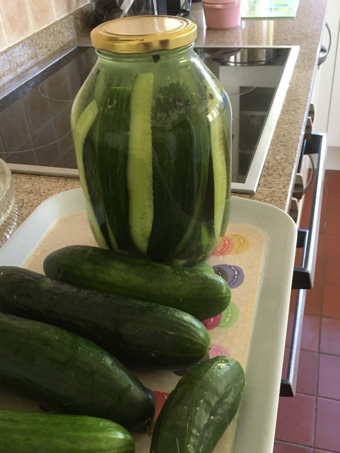 It has to be enough as the shelves and cupboards are full. The cucumbers are still growing well so I took a large jar and pickled the cukes for sharing with visitors at the end of the month. They will be stored in the refrigerator.