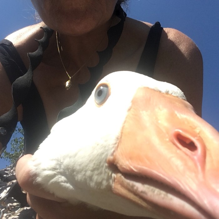 Outside I caught one of the goslings and gave it a cuddle. He or she (I think we have one of each) was not pleased and honked in terror or anger.
