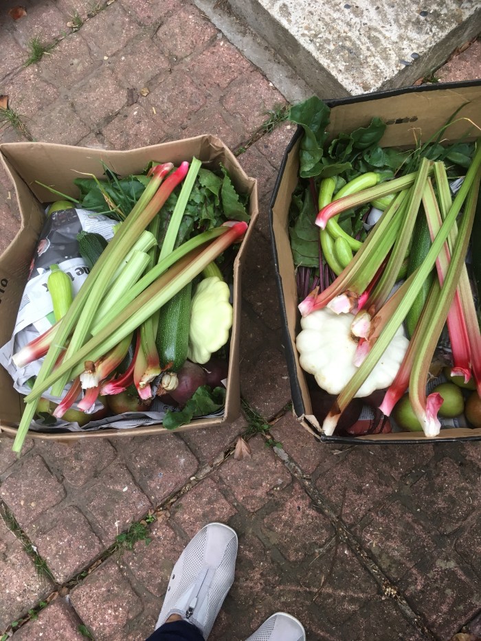 Patty pans, courgettes, Tromboncinos, spring onions, Bedfordshire champion onions, cucumbers, cooking apples, eating apples, rhubarb, runner beans. Gifts to go to London tomorrow.