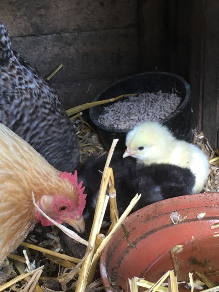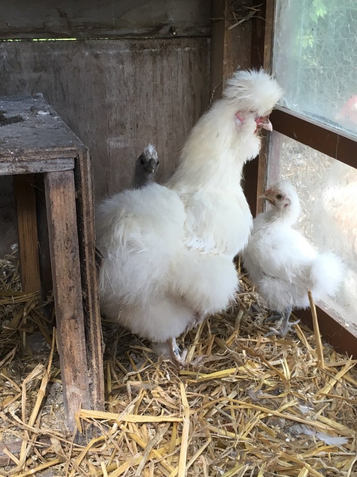 Mrs Silkie and her chicks have moved to the quarters she shared with their late father.