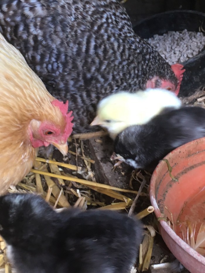 The three little chicks daren’t step out of line with two mothers watching over them. Mr Bantie cockerel keeps on escaping into the garden, perhaps to get away from being hen pecked.