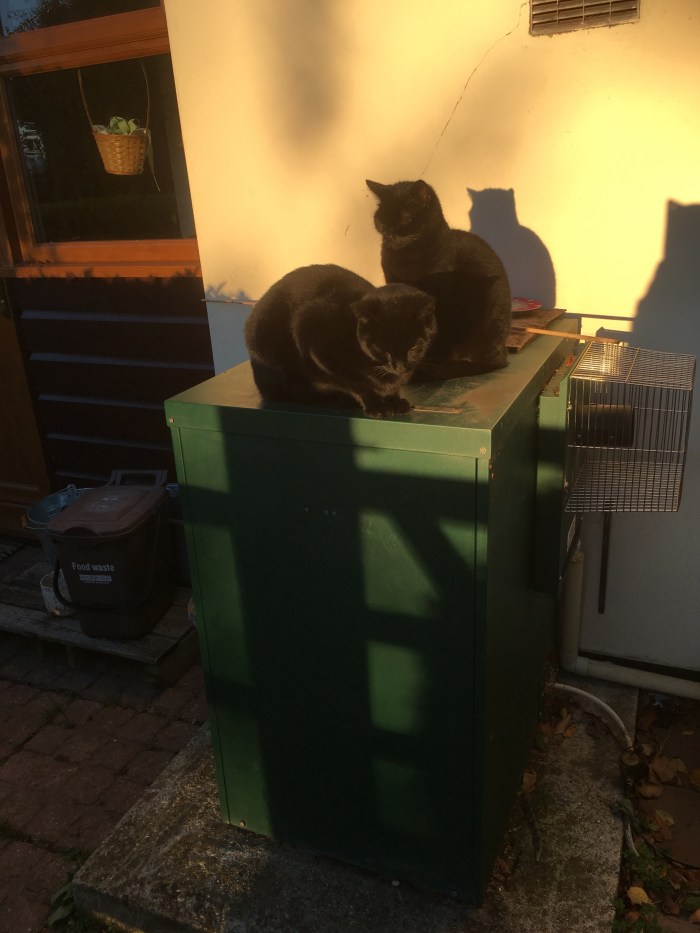Picked this bucketful just now but many more to come. The cats won’t help- they are enjoying the warmth of the sun.