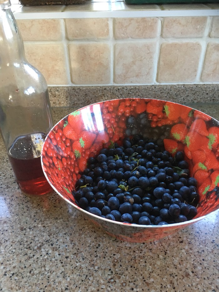 Picking Bramley apples and dividing them into three piles. One pile too bruised for us but fine for Lucy. One pile perfect and ready to wrap in newspaper and store in a cardboard box and the remaining apples to be made into crumbles and compote over the next week or two. Then it was over to the hedges, where we picked nearly two kilos of sloes.