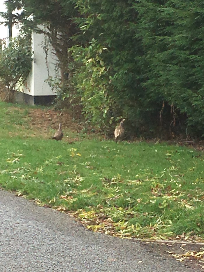Two pheasant hens outside the gate