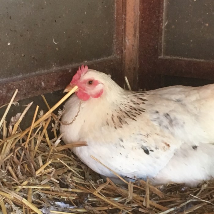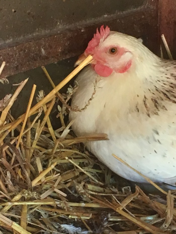 One of the young hens is sitting quietly as she lays an egg in the corner of the new hen house. I will collect it (and thank her) later