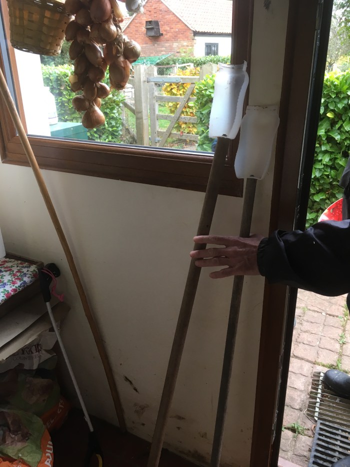 The young hens have started laying in the poultry house near to the kitchen. Well done girls ….. but they lay their eggs in the corner farthest from the door. I have been using a stick to roll the eggs towards me and it’s a bit annoying and the eggs are liable to break. Chris has invented and made an “egg collecting stick” and we will try it out today.