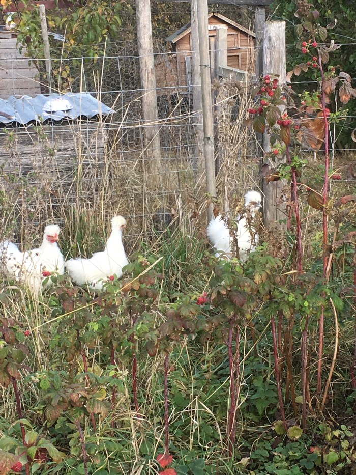 The Silkie chicks have found a way out of their run and the orchard, through the “chicken wire” so that they can play around the raspberry canes.