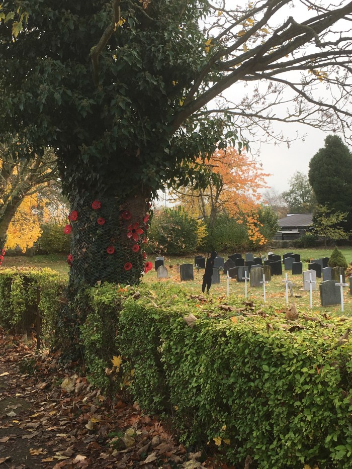 The church at Roxton was decorated with red poppies and flags to commemorate the “Great War” and the lives of those who fought and never returned. The poppies in the trees were made from plastic bottle and painted red and black, made by the pupils of the local Roxton school……may they never have to fight and kill and die.