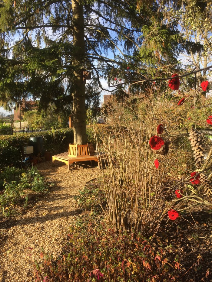 At the triangle outside the St Denys Church one of the trees was decorated with crocheted, red poppies to commemorate Armistice Day.