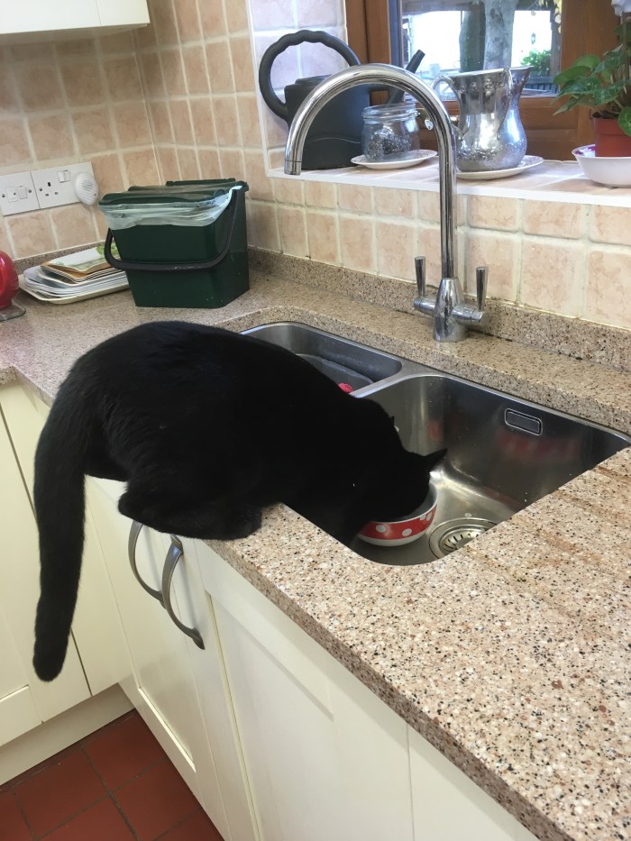 As soon as Jeremy left the room the expectant cat (Nigel of course) jumped up onto the sink to try and lick the bowl.