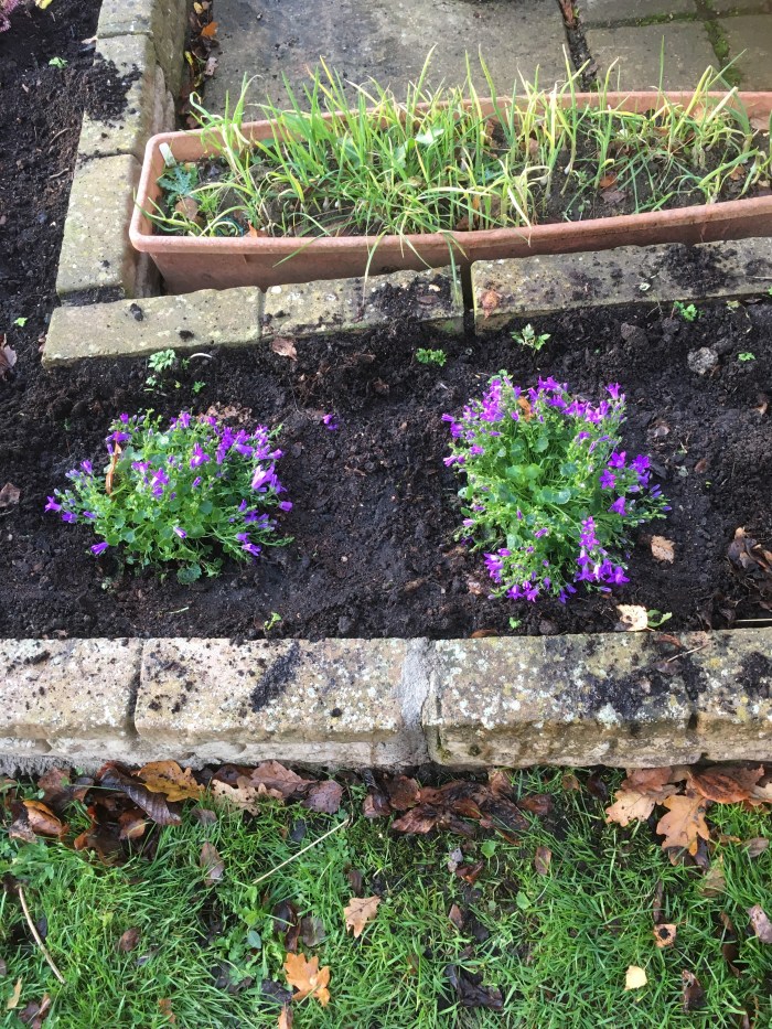 and two purple campanula plants (bought at the very good plant stall on the Thursday market square in St Neots) needed to be planted