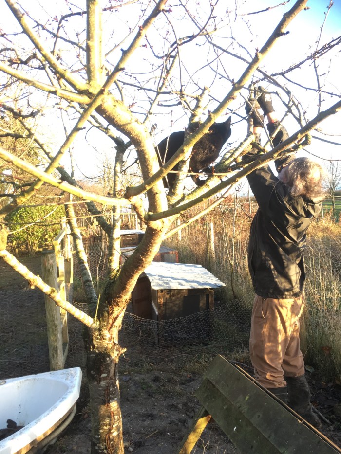 And pruning fruit trees and bushes with secateurs and a “just the job” pruning saw which I bought Jeremy a few months ago. Nigel (tree climber extraordinaire) was “helping”.
