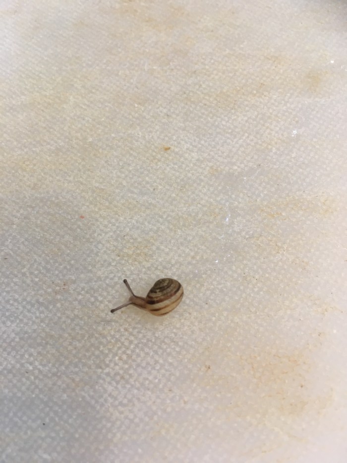 This tiny snail came in with some rocket leaves. I put it outside again.