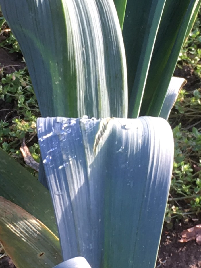 As we sat outside the poly tunnel and drank an afternoon cuppa I saw a shimmering movement on a leek plant. On closer inspection it was a droplet of water catching the afternoon sun.