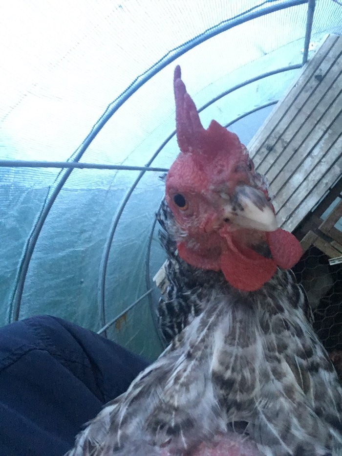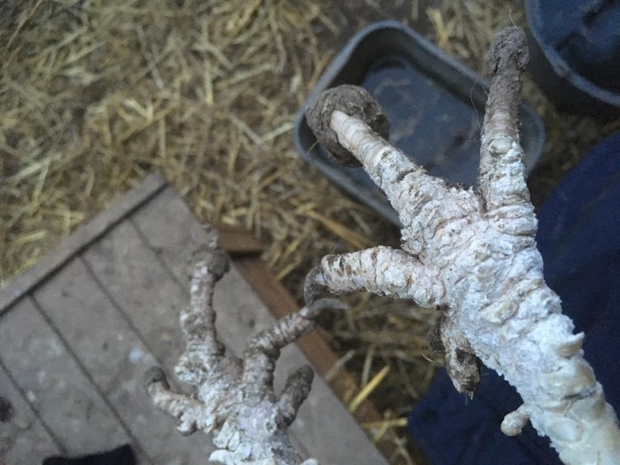 Yesterday I noticed that one of the hens had a huge bolus of hardened mud stuck to one of her claws. Mrs Silkie had a similar problem last year when the orchard was very muddy.