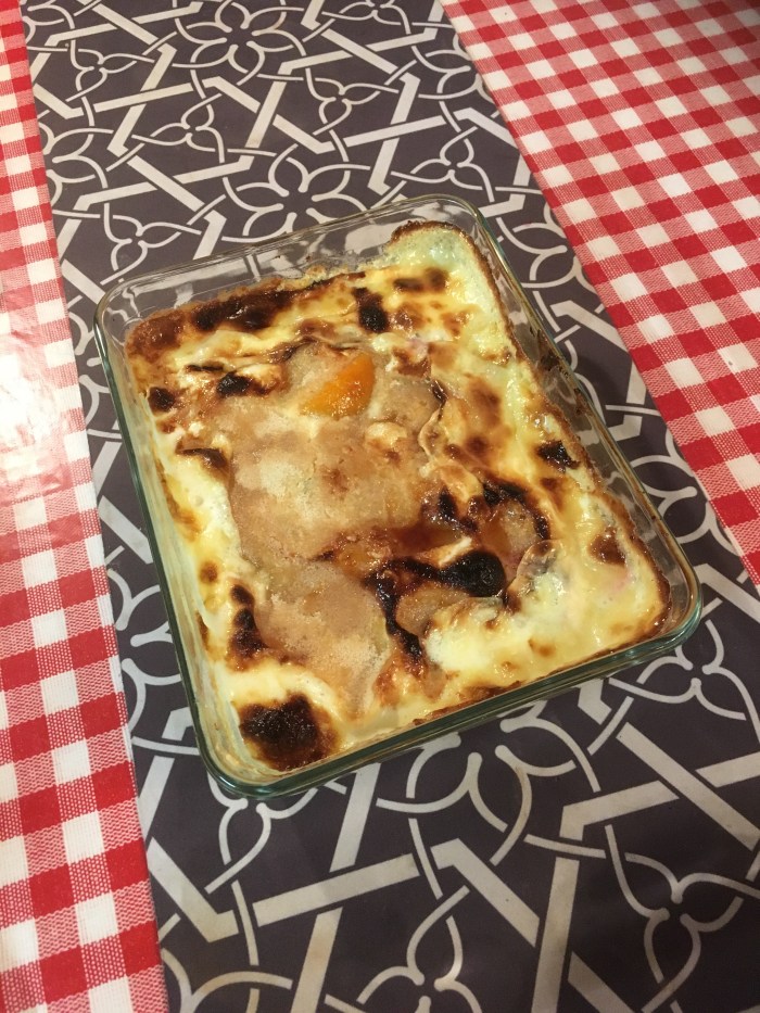 Mum brought with her from London four ripe peaches and I had a pot of unused double cream in the fridge. I peeled the peaches and cut them into a saucepan along with some of our homegrown frozen black currants. I poached them for three minutes until soft then put in an ovenproof dish to cool. Then I whipped the cream and covered the cooked fruit with same and popped it all in the freezer. As we ate our main course I turned the grill to high, took the dish out of the freezer and covered the cream with a good layer of brown sugar. It went under the grill until the sugar began to caramelise and then…….we polished off the lot!