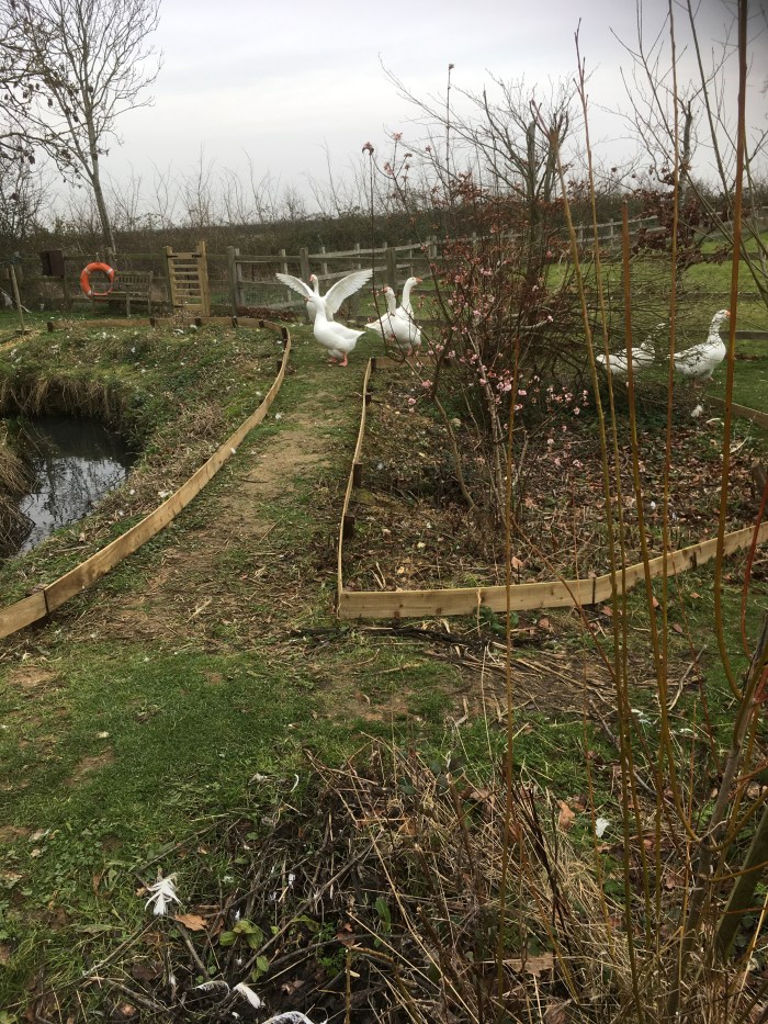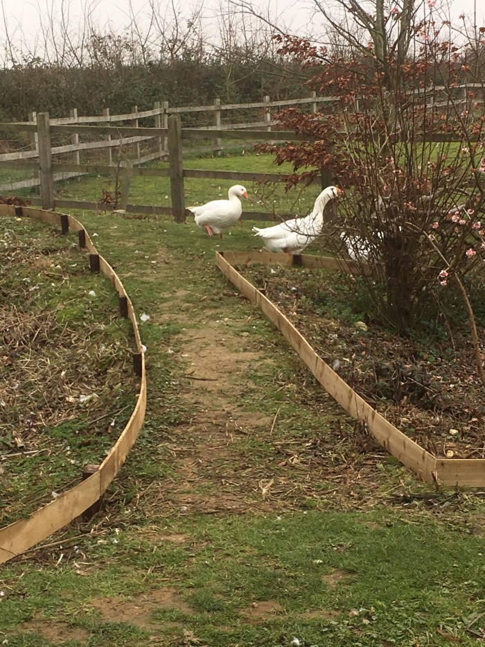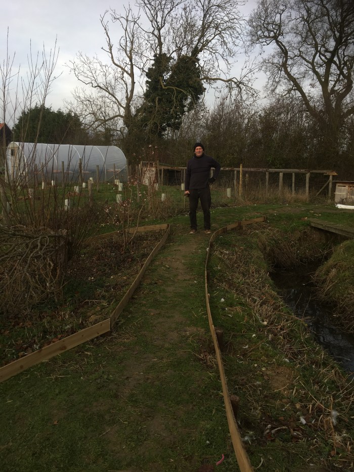 Yesterday Jeremy bought the wood and today Chris put up the structure to mark out the paths around the goose pond. We are hoping that the daffs we planted will come up along these borders.