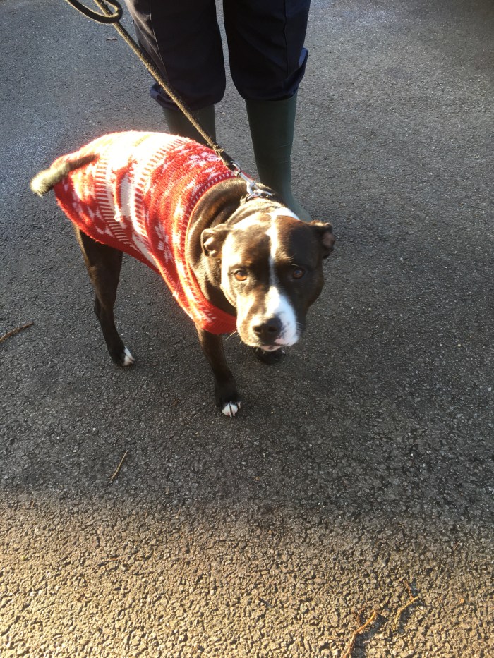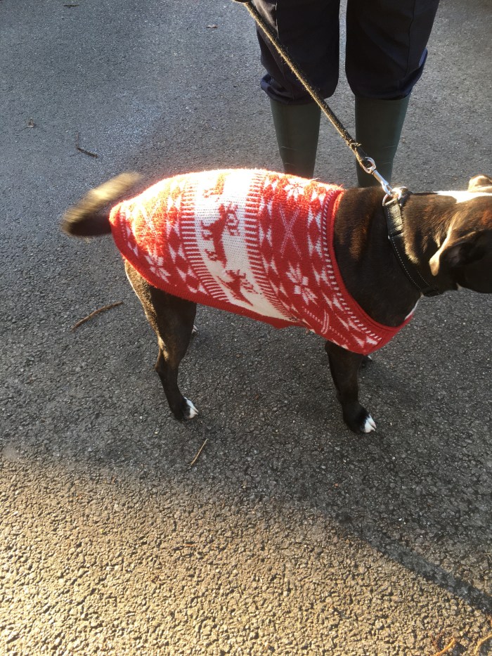As we set out on our Wednesday walk we stopped to talk to Elmo and his owner. Elmo was wearing a fetching Christmas jumper.