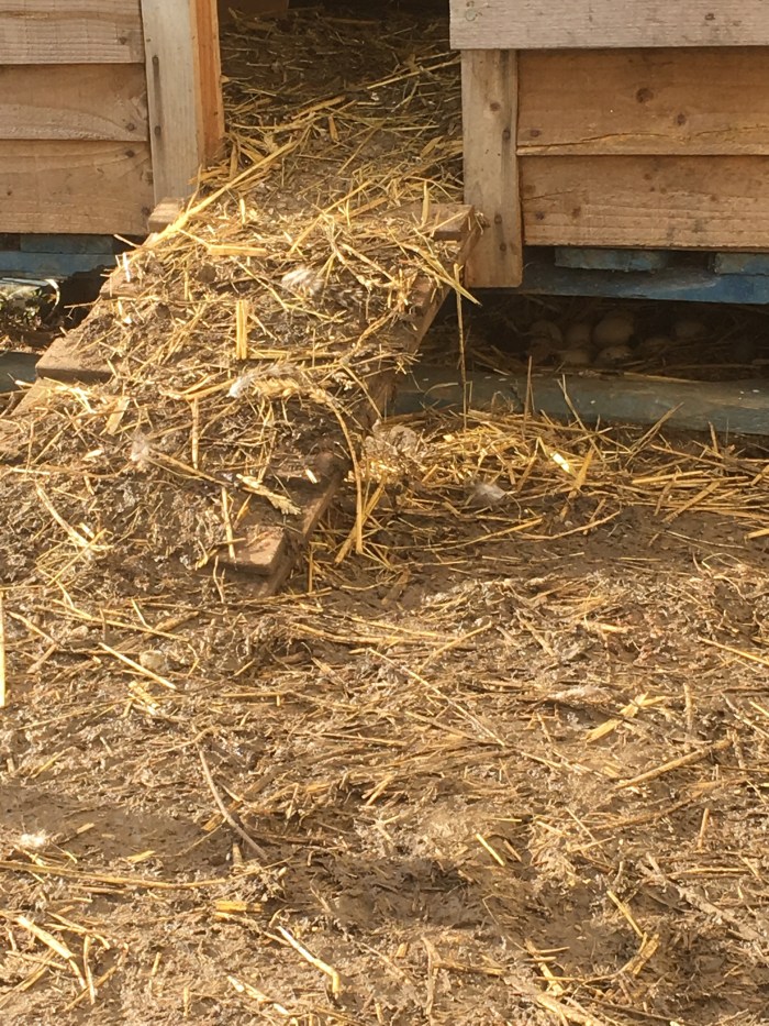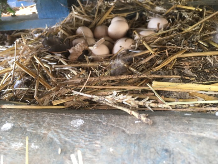One hen has gone broody in the hen house in the paddock and we have put some duck eggs under her. I went to check on her just now and spotted a clutch of eggs under the hen house.