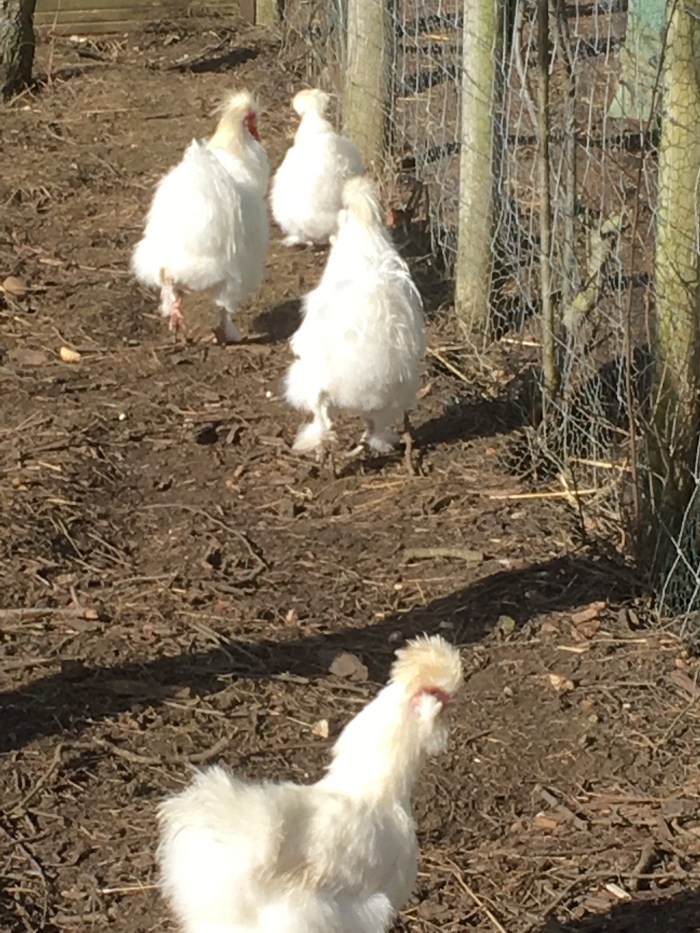 The Silkie chicks that we thought were three girls have turned into two cockerels and one hen. They are chasing their mum and sister in a very springlike manner!
