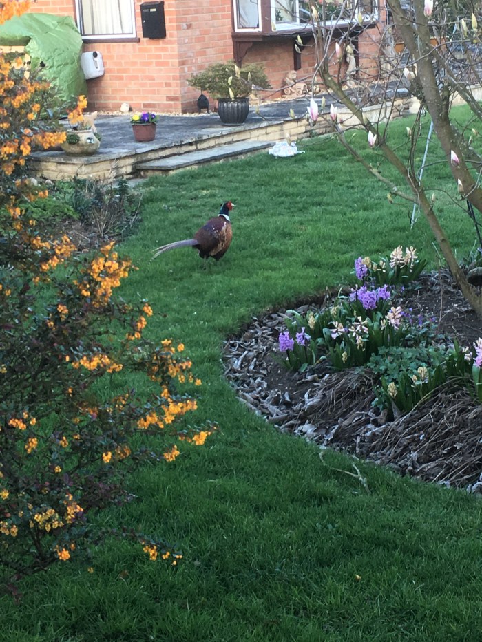 I was visiting a friend this afternoon and as I was leaving a beautiful pheasant sauntered into view. “That’s my husband’s friend”, she said. It seems that the pheasant had appeared last year in a bedraggled and sorry state and been fed and brought back to health by my friends husband.