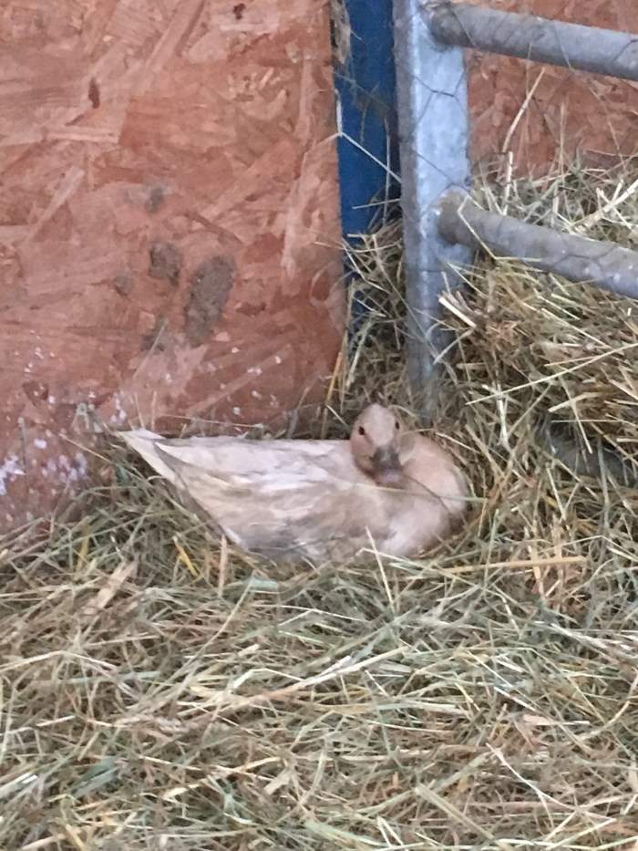 Dafka is a word not easily translated but in this context let’s says it’s a contrary duck. With a duck house full of straw and good and water this duck has chosen to lay her eggs in the corner of the sheep barn and is sitting on them with a dreamy look in her eye