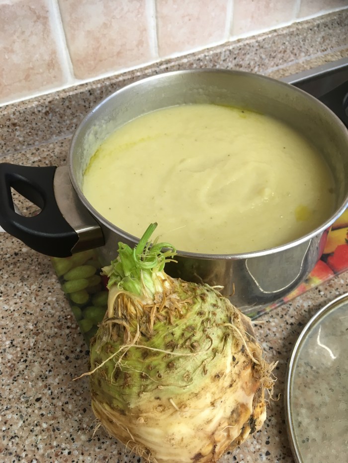 Soup made with onions, leeks, loads of celeriac and a few small potatoes. Will add some cream before serving.