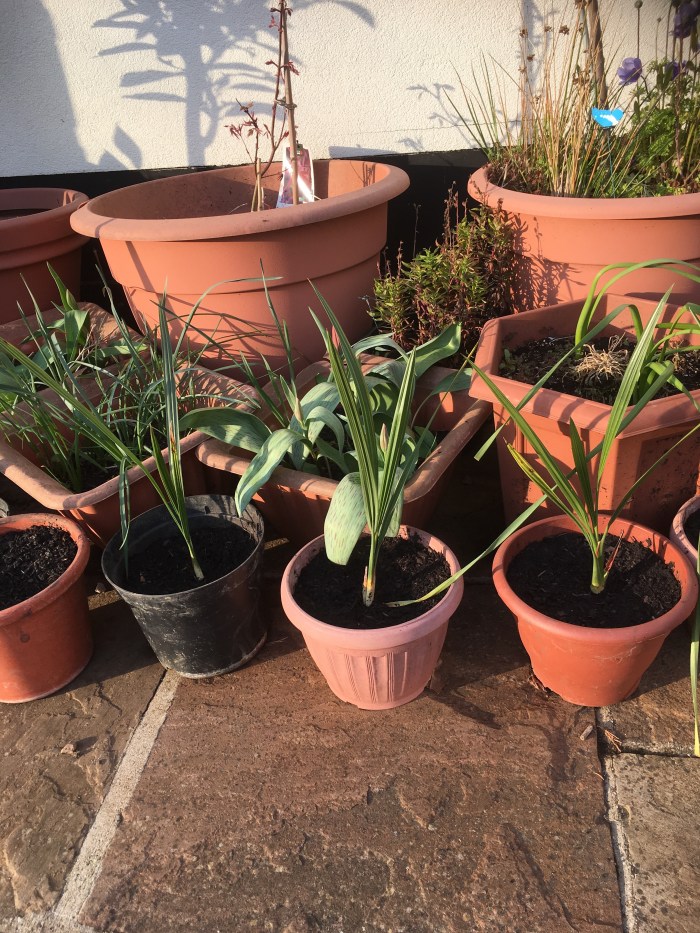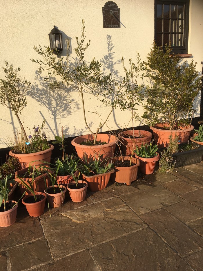 The date plants and avocados (grown from avocado stones and date pits and nursed in the house all winter) go out into the courtyard. Will they survive?