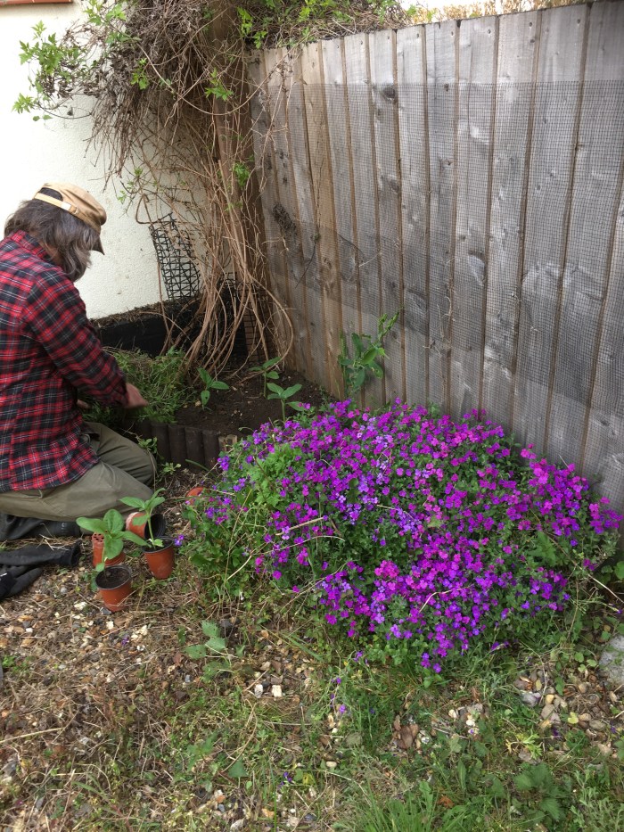Jeremy plants out sunflowers grown from seeds he saved last year.