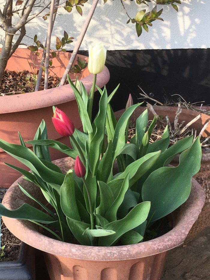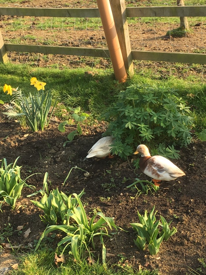 Tulips in the courtyard and sunflowers in tubs and ducks roaming free ….but the dead pigeon this morning was a stark reminder that nature is not always peaceful and I caught the cats fighting, this afternoon, over the remaining leg of a rabbit that Mabel caught!