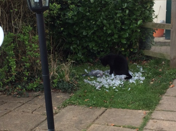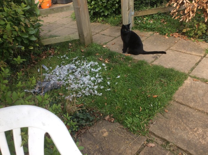 He has spent all morning trying to climb up to the nest box where the blue tits are trying to feed their nestlings. Losing patience, he caught an unsuspecting pigeon.