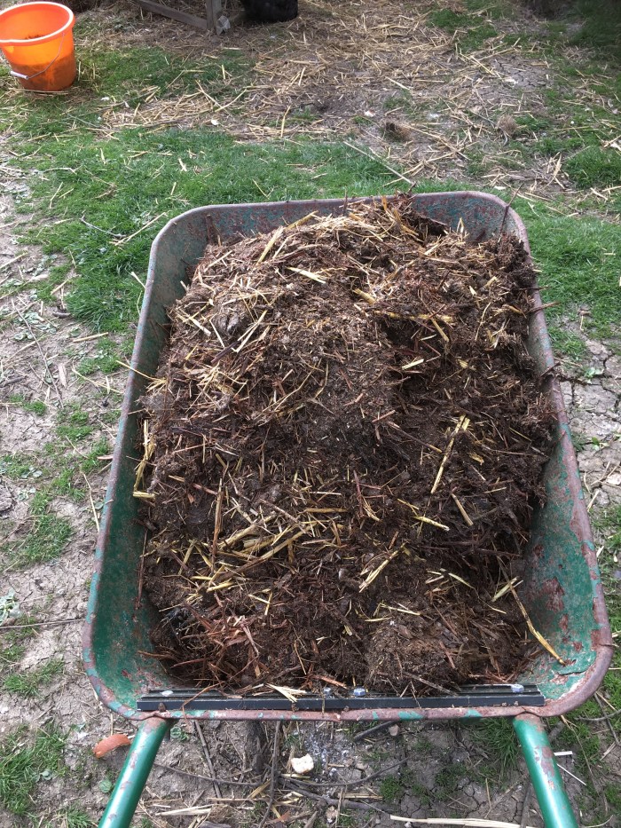 I dug out the chicken straw and droppings and shovelled them into a wheelbarrow. The hens now have a clean, sweet smelling house.
