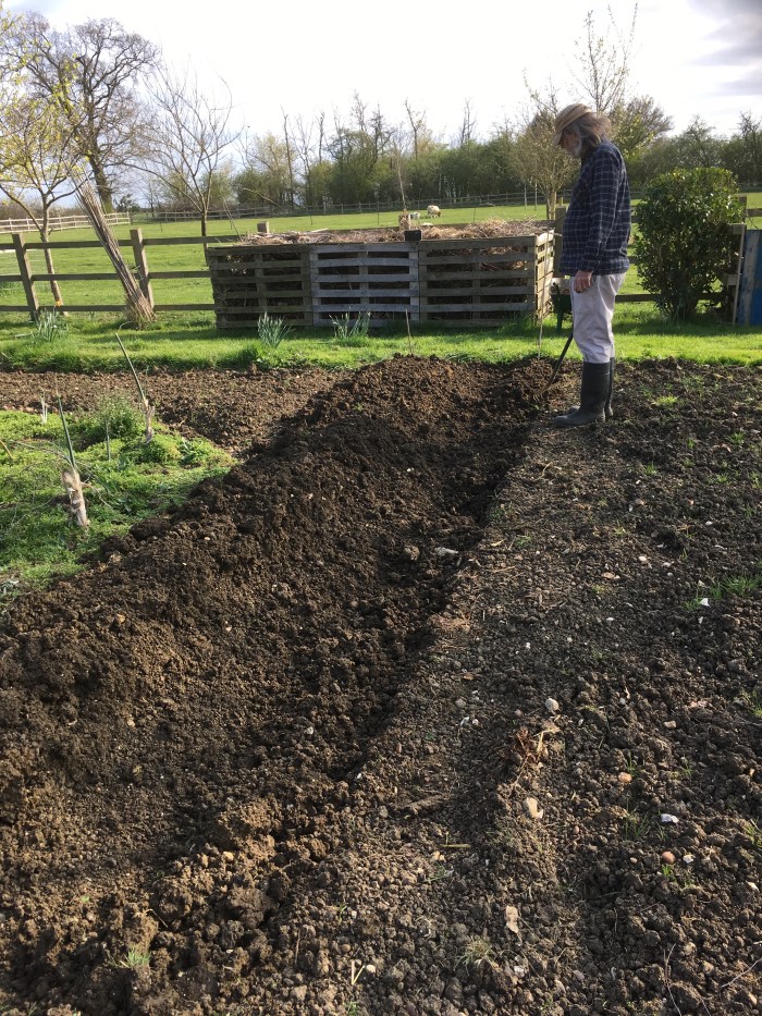 The manure has gone into the potato trench that Jeremy dug this afternoon. One row of Bambino’s and one row of Arrans with several more rows of potatoes to follow.