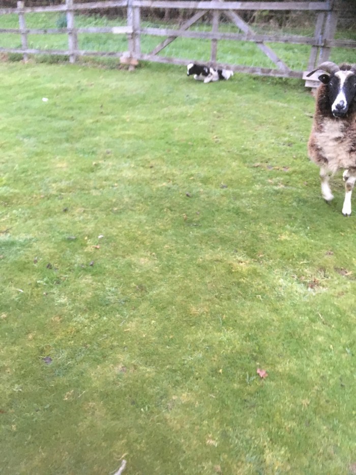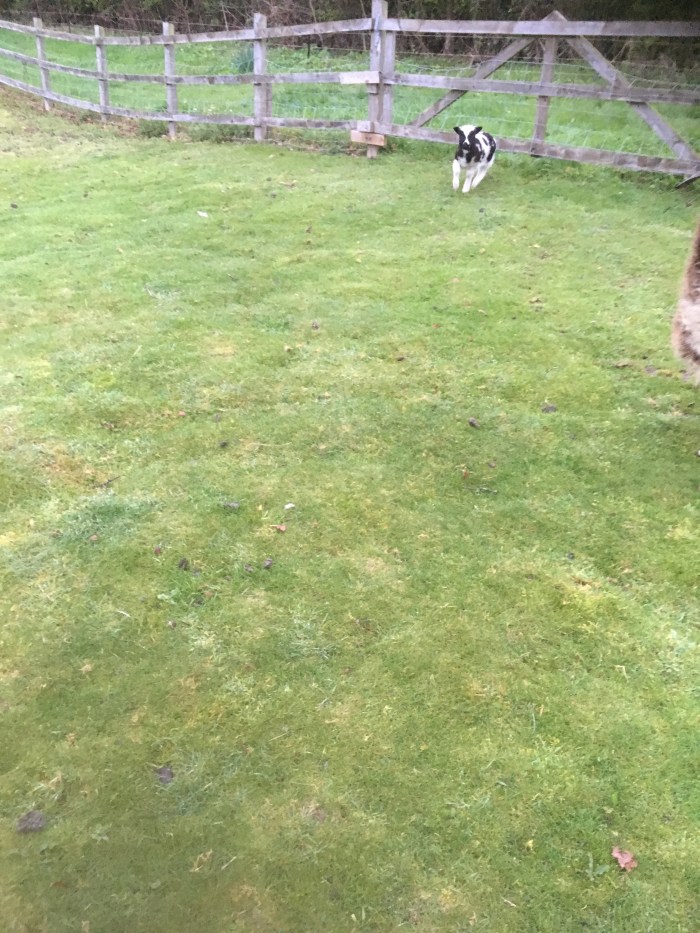 I went into the field this morning, bottle in hand, and called, “Lamb”. No response. So I walked across the field towards his mother and twin sister. Then I spied him on the wrong side of the wooden fence – where the grass is greener and lusher, of course. He had crawled under the gate but managed to wriggle back to drink from his bottle.