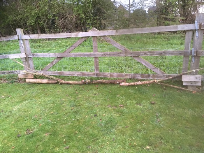 I went back to the trailer,where we had collected some tree thinnings, and carried two lengths over to the gate to try and block the gap. I will secure it later when I am more awake!