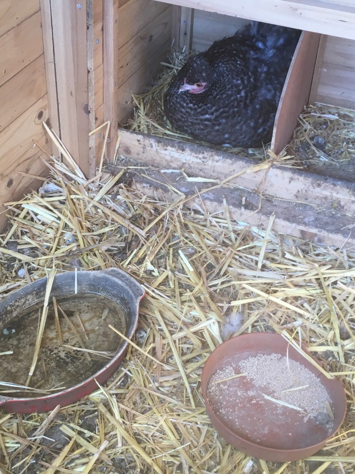 The little duckling died today. When Jeremy went out to see the birds this afternoon the duckling had become entangled in mother hen’s feathers and, although warm, was no longer breathing. Jeremy buried the little creature and mother hen emerged from the hen house to join the flock. However she is now sitting forlornly in the nest box. Risking life and limb, I entered the goose house and stole two eggs to put under mother hen. Let’s see what happens.