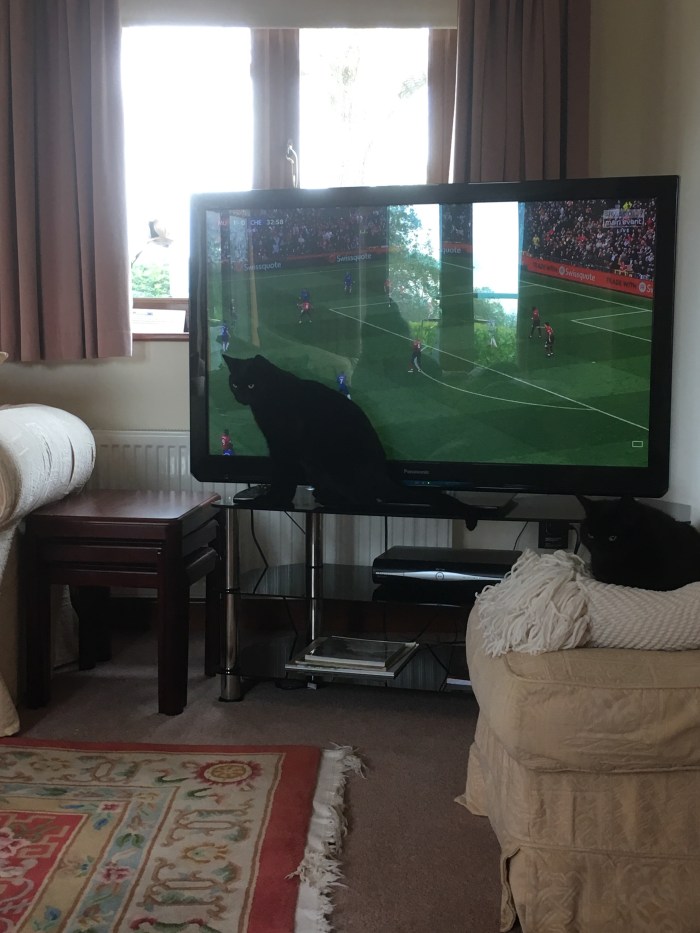 The cats are showing a vague interest in an important premiership match, this afternoon, between Chelsea (my team) and Man Utd (Jeremys).