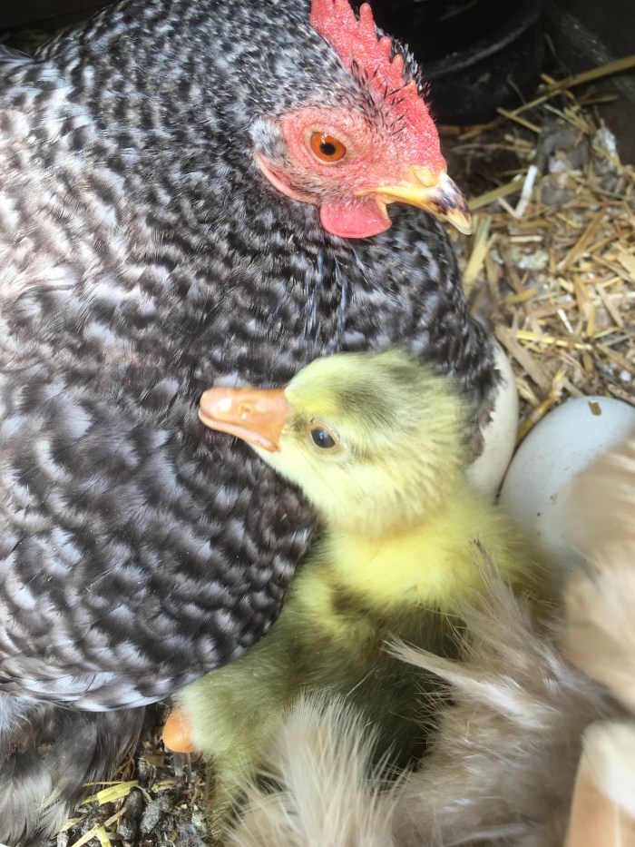 A little gosling had hatched under a Bantie chicken. Well done both and thank you Heather who suggested putting goose eggs under our broody hens last year. It works and the geese are happy that they don’t have to sit still for 35 days.