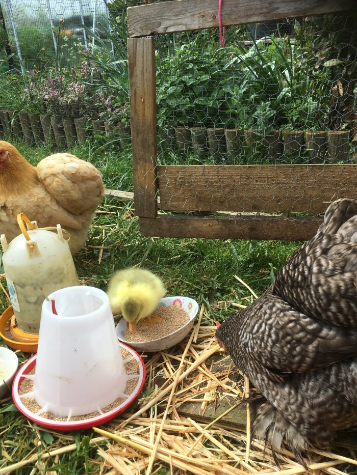 Yesterday we moved the three remaining goose eggs, the two broody bantams and the newly hatched gosling to more fitting accommodation near the pergola. There is a run and a house so the rapidly growing baby can stretch its legs and get plenty of fresh air. This little goose will be “hen pecked” by two mothers as both seem to believe it’s their hatchling. However they seem happy to co parent and co sit on the remaining three goose eggs.
