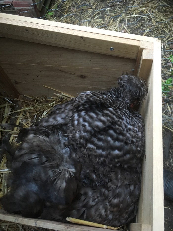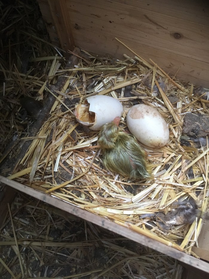 Mrs Bantie, in the orchard, has been sitting in splendid isolation for five weeks. Tonight, when Jeremy looked in on her to check that she had food and water, he lifted her up and found a newly hatched gosling beneath her feathers. Well done Mrs B. Will the other egg also hatch?