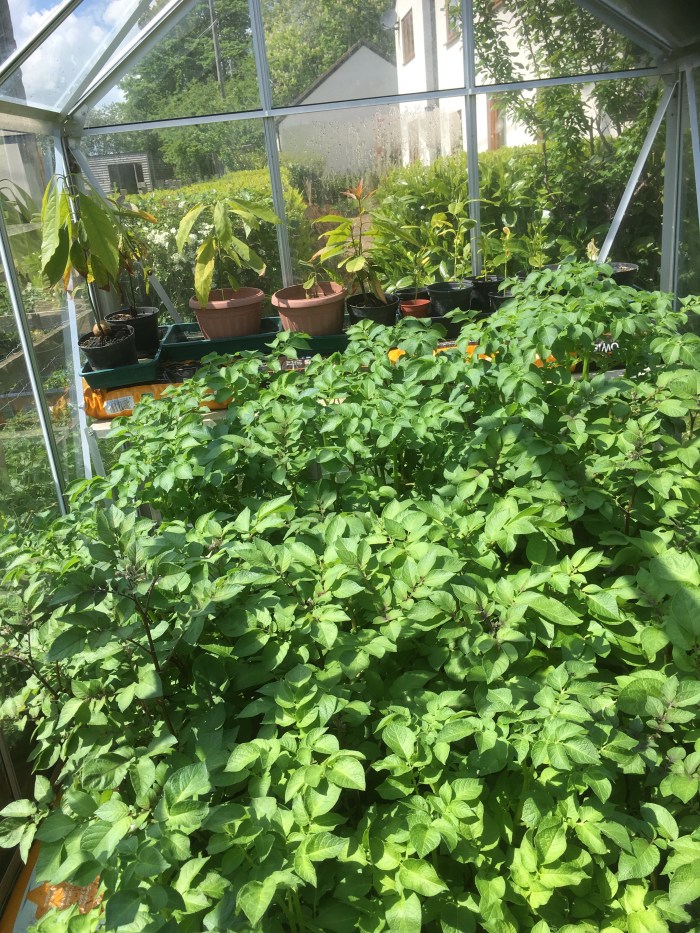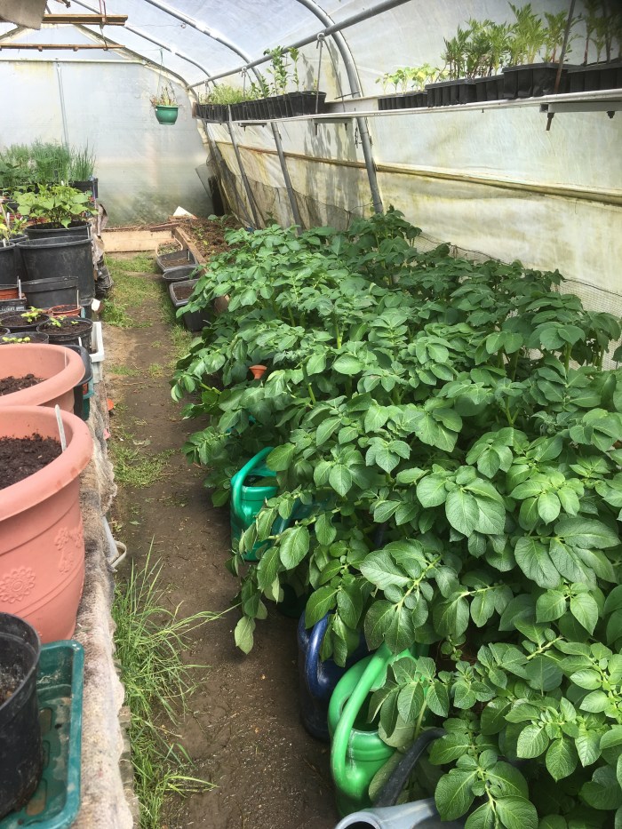 New potatoes in the polytunnel and the greenhouse – how long until they are on my plate?