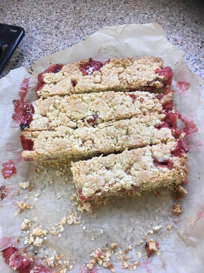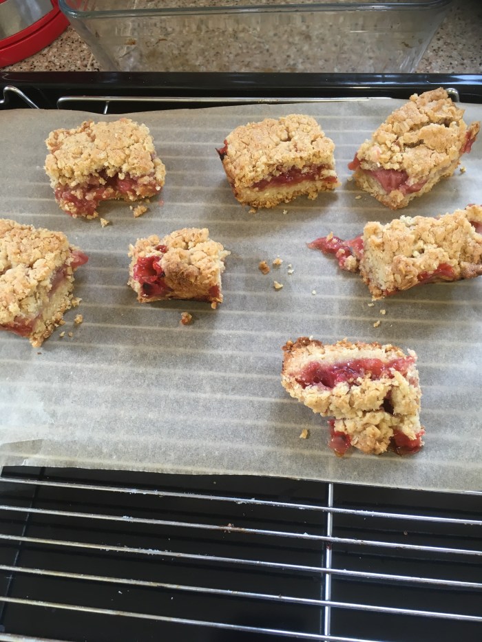 I saw a recipe in the weekend paper for a strawberry crumble slice and I had to try it out today. It’s made with butter, brown sugar, oats and flour and the middle is a layer of homemade strawberry jam and sliced fresh strawbs, I didn’t bother with the other ingredient of either cranberries or raisins. They look tasty which is a pity as I am trying to cut down on sugar. I just returned from the dentist, again. A legacy of daily sweets throughout my childhood and (I admit) into old age!