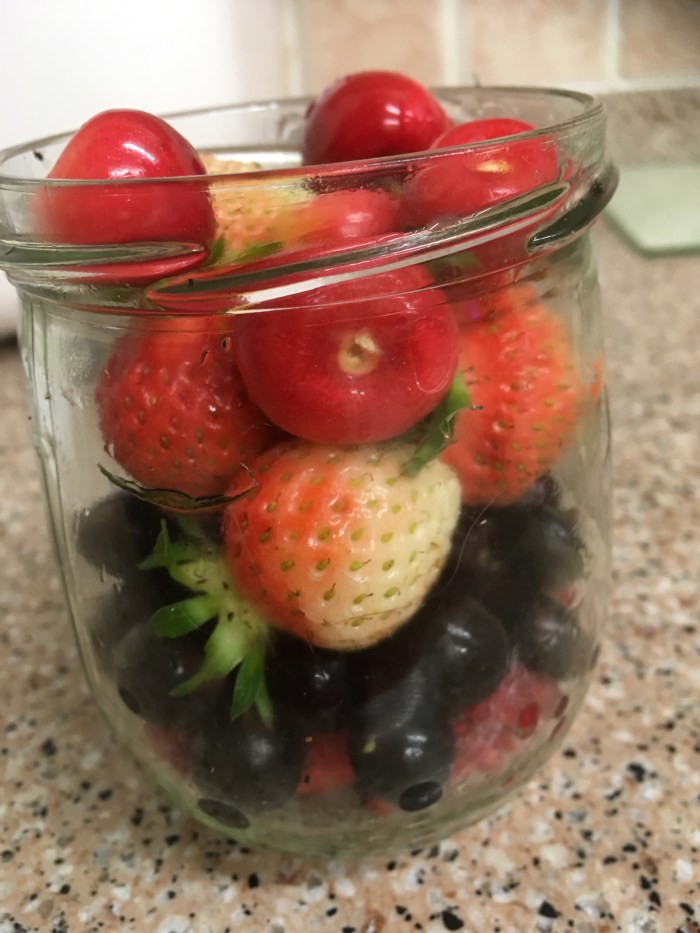Some sweet treats to bring in – ripe raspberries (the first ones), some blackcurrants, cherries and strawberries (not quite ready but they’ll do).