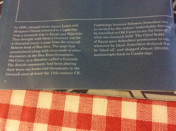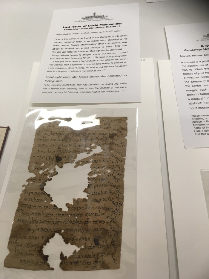 Protectzia (aka Jeremy’s Kings College card) allowed us to walk through the grounds of Kings College Cambridge on graduation day where students milled around in black gowns accompanied by proud parents. We walked to the University Library where we joined a group from HGSS for a tour of the Cairo Genizah fragments. A Genizah is a place – a cupboard, box, small room – for worn out holy texts and scrolls.