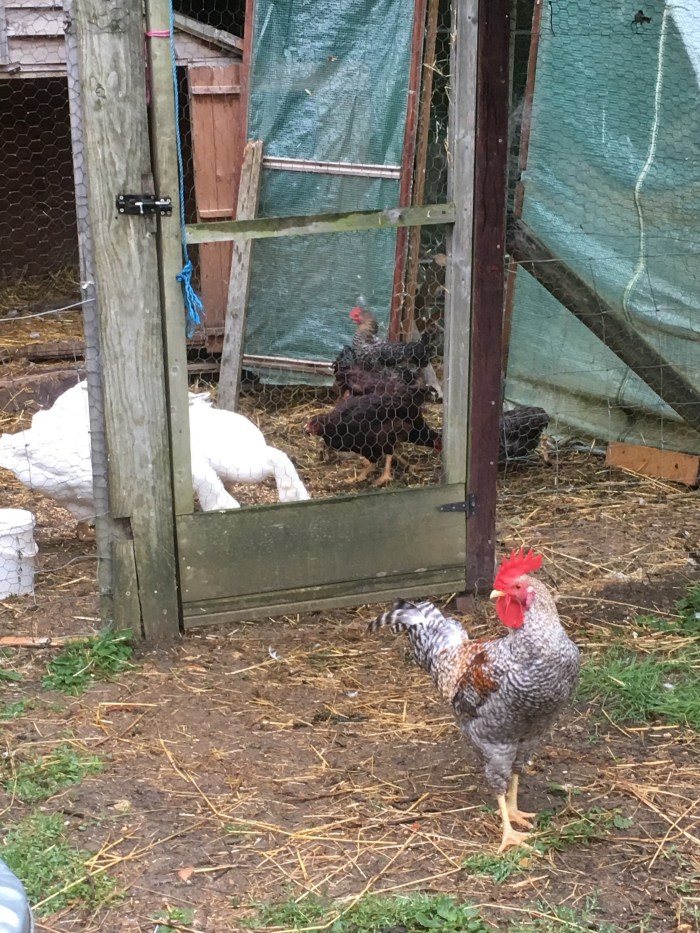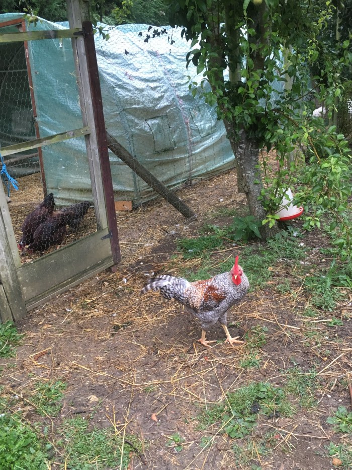 The Araucana cockerel is a macho South America male who crows loudly and struts his stuff, despite being much smaller than the other cockerel in the run. He was terrorising all the birds and even attempting to mate with the goslings! The solution has been to put him out in the orchard (with food) every morning and only allow him into the safety of the run at night after all the other birds have been locked up in their houses. I would like to think that he will change but I think his genes will continue to dictate his behaviour.