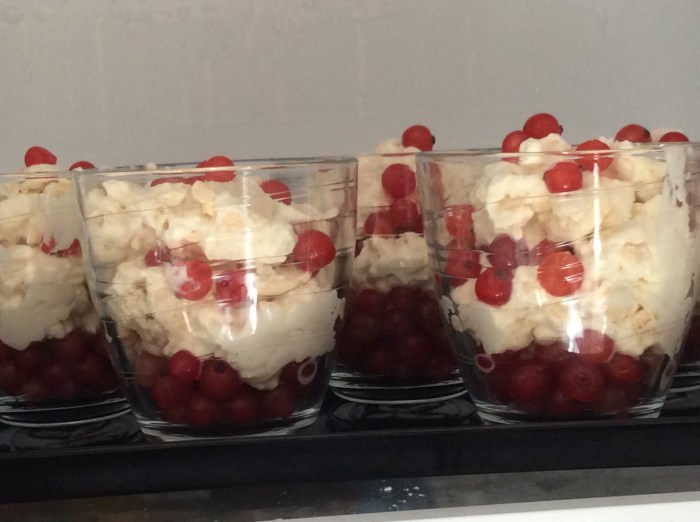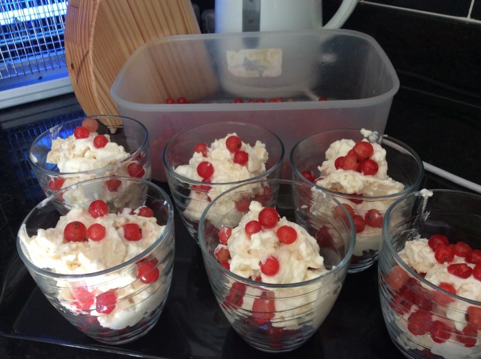 I made meringues yesterday, whipped some cream today and added crushed meringue and some of the abundant red currant crop.
